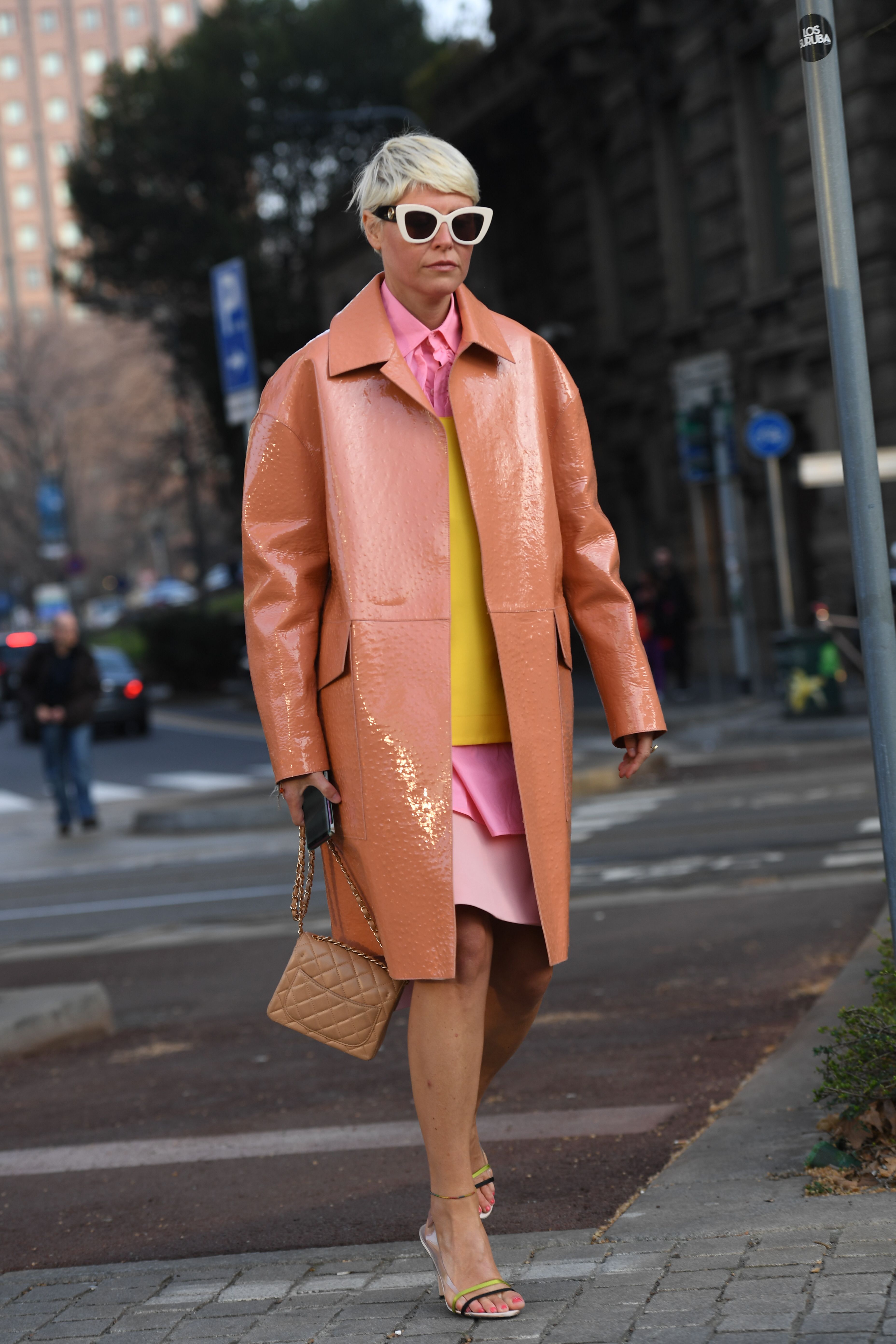 Stylist Elisa Nalin is seen in a pink and yellow ensemble with a brown mac jacket during Milan Fashion Week 2019.