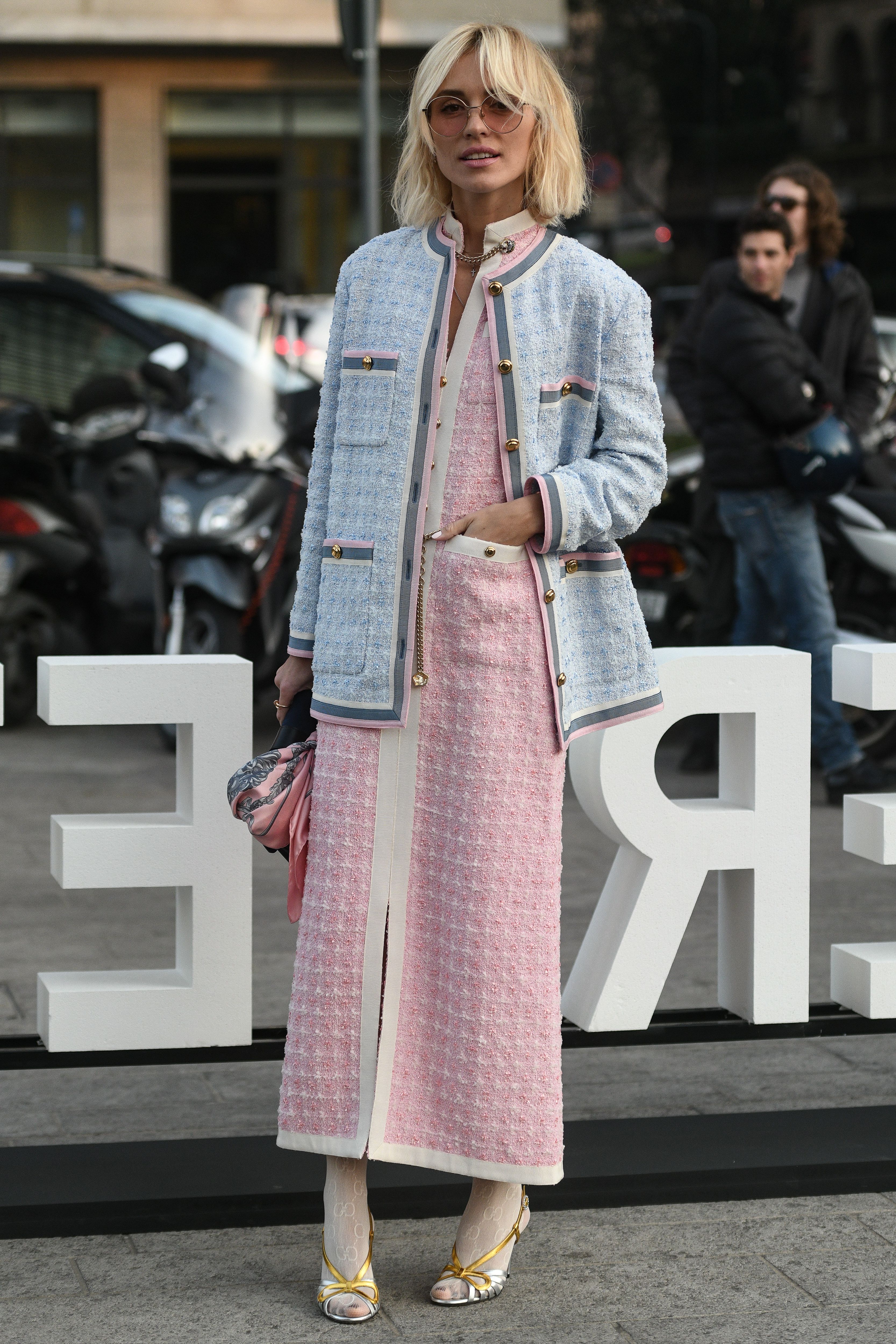A guest wears a pastel pink dress and blue jacket outside Milan Fashion Week.