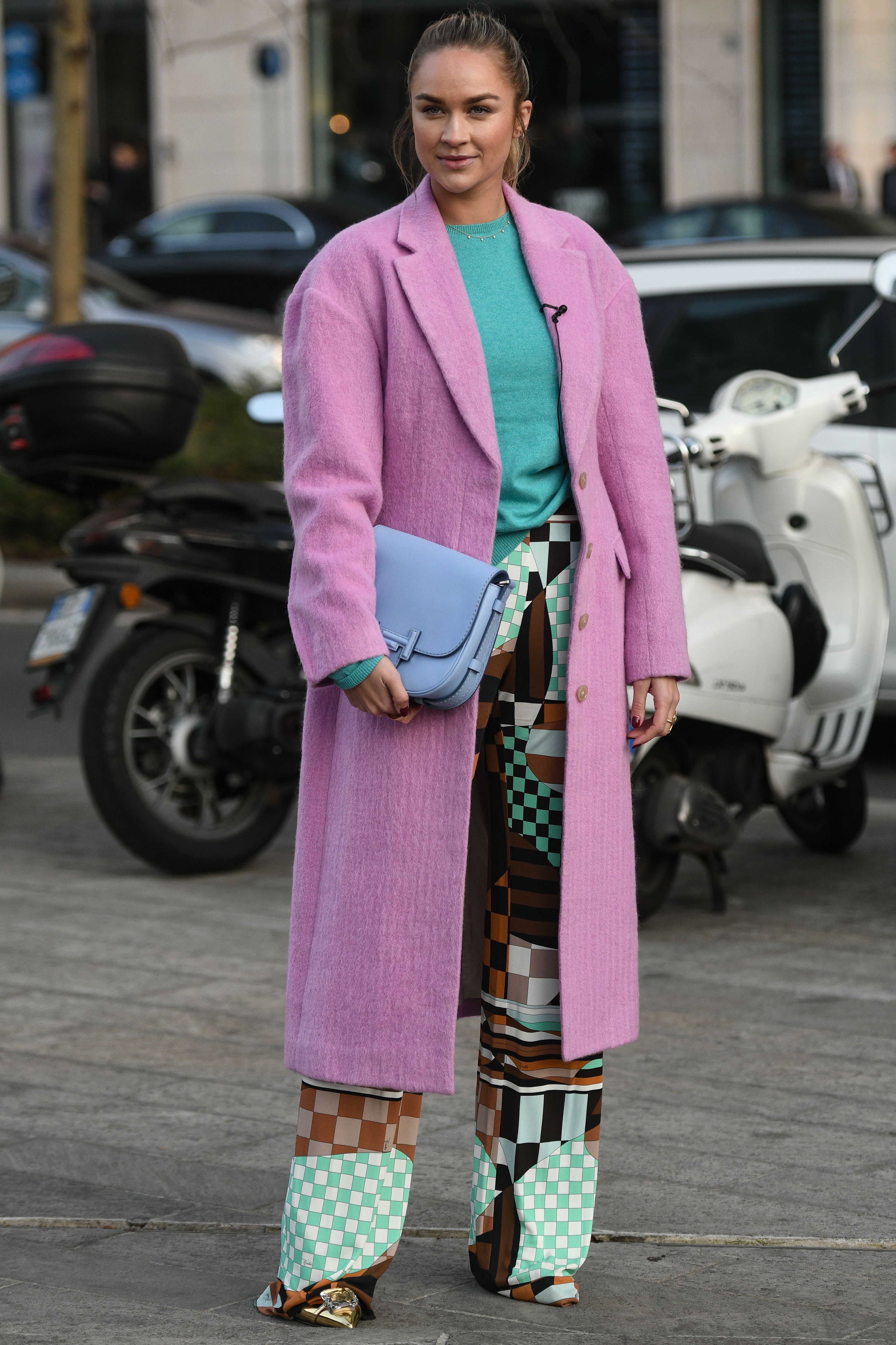A guest is seen wearing a long pink coat and patterned pants during Milan Fashion Week.