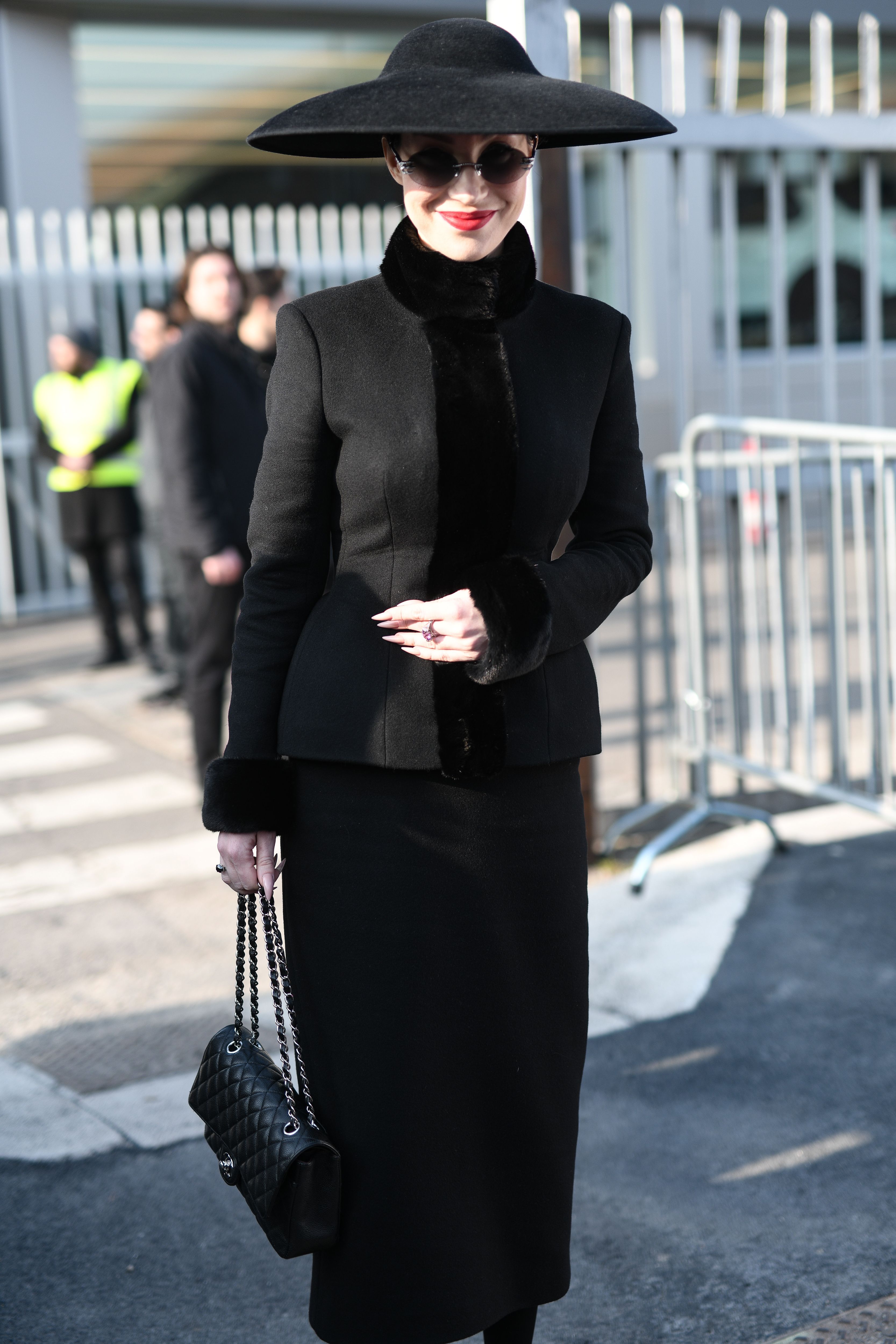 A guest is seen in a chilling all-black ensemble outside Milan Fashion Week.