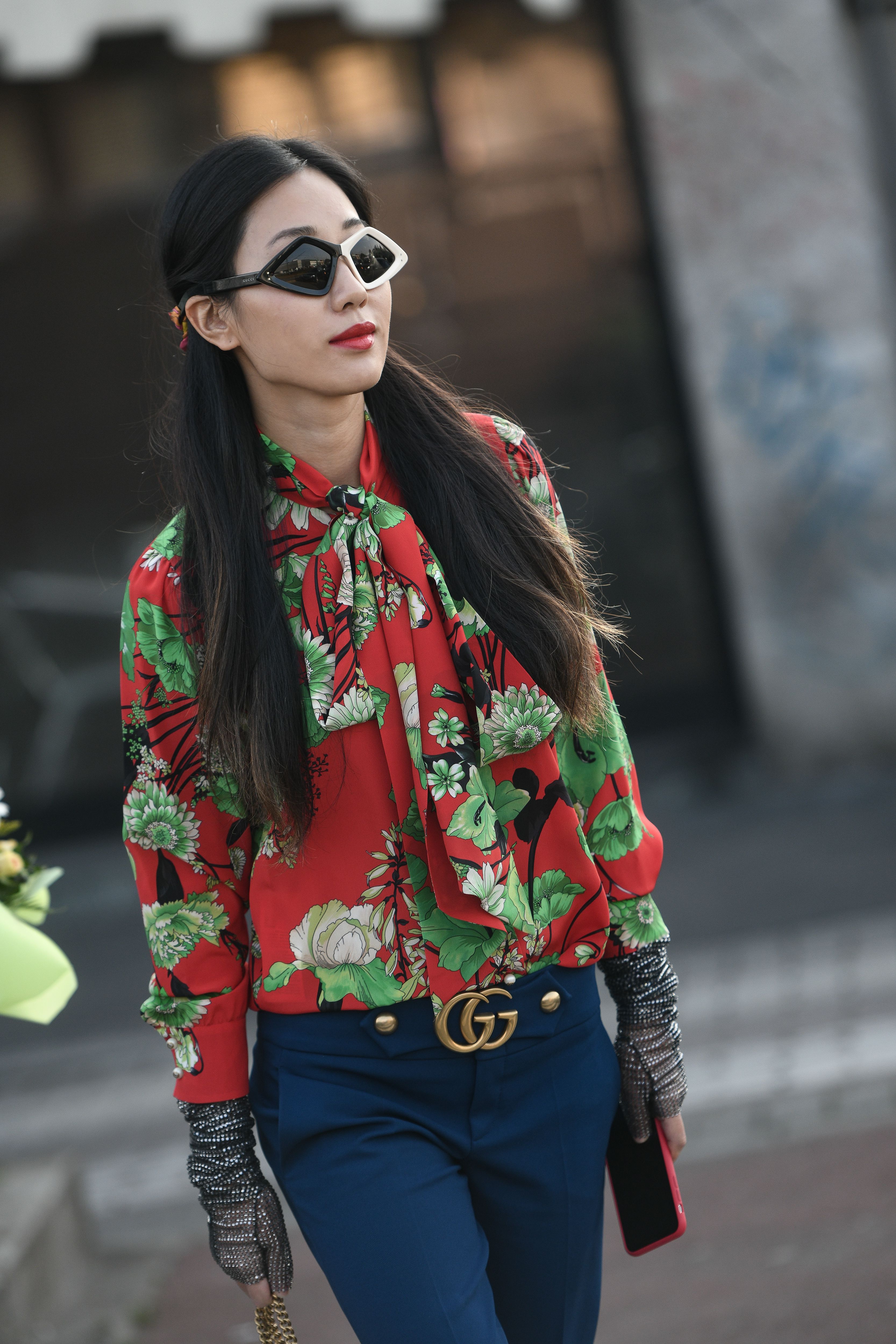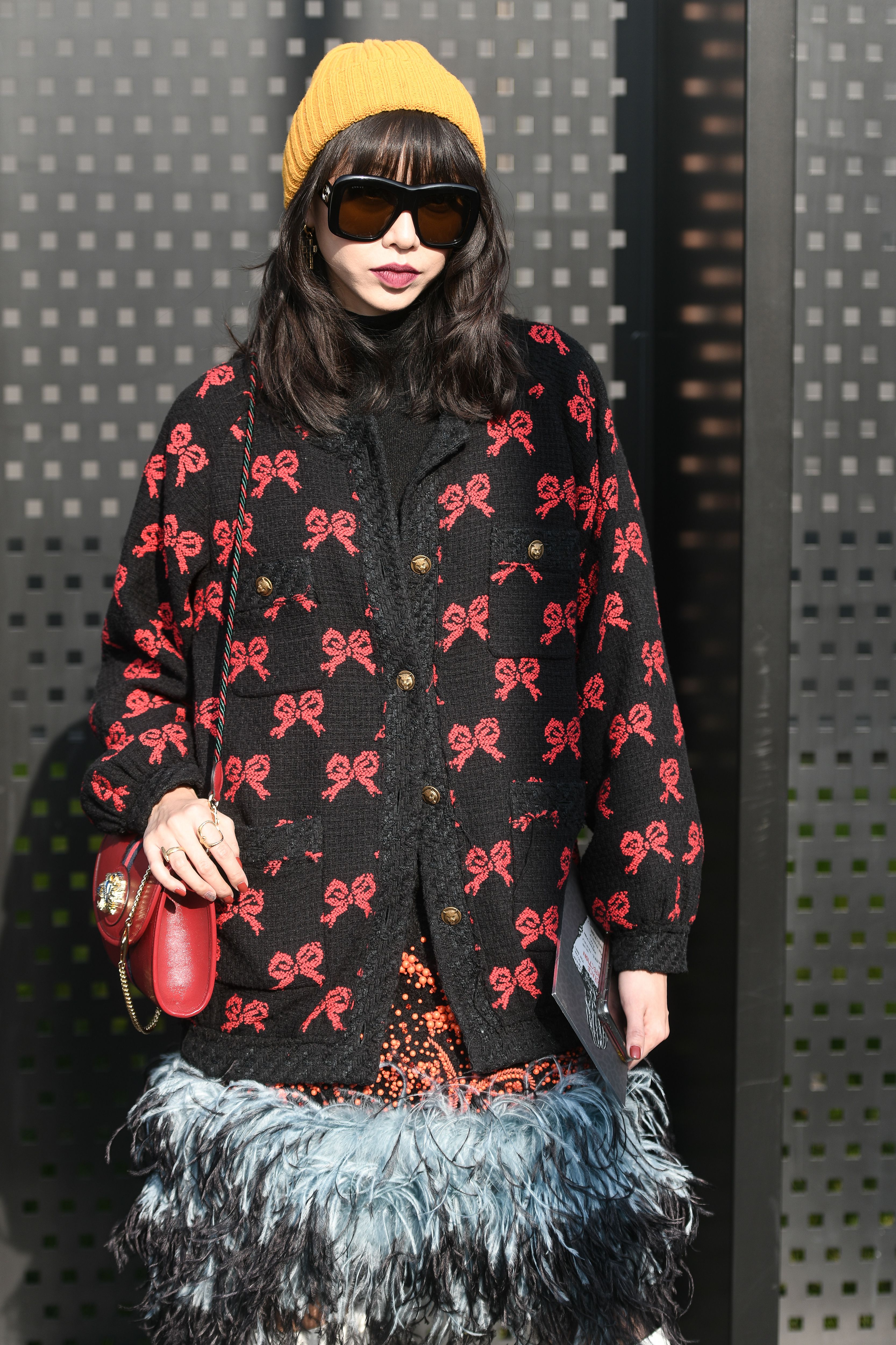 Influencer Yoyo Cao wears a Gucci look outside of Milan Fashion Week 2019.