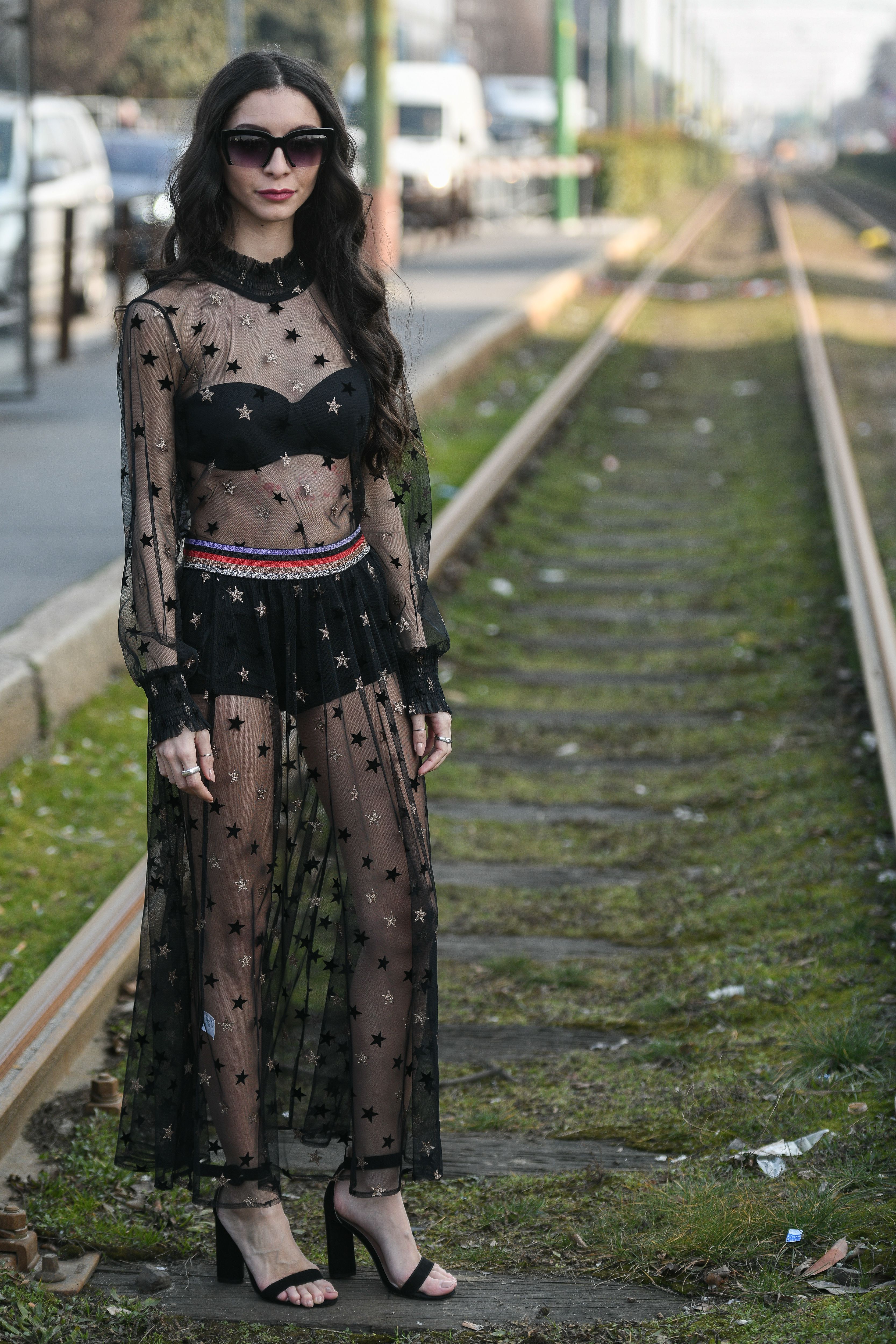A guest is seen attending Milan Fashion Week in a sheer star-patterned dress.