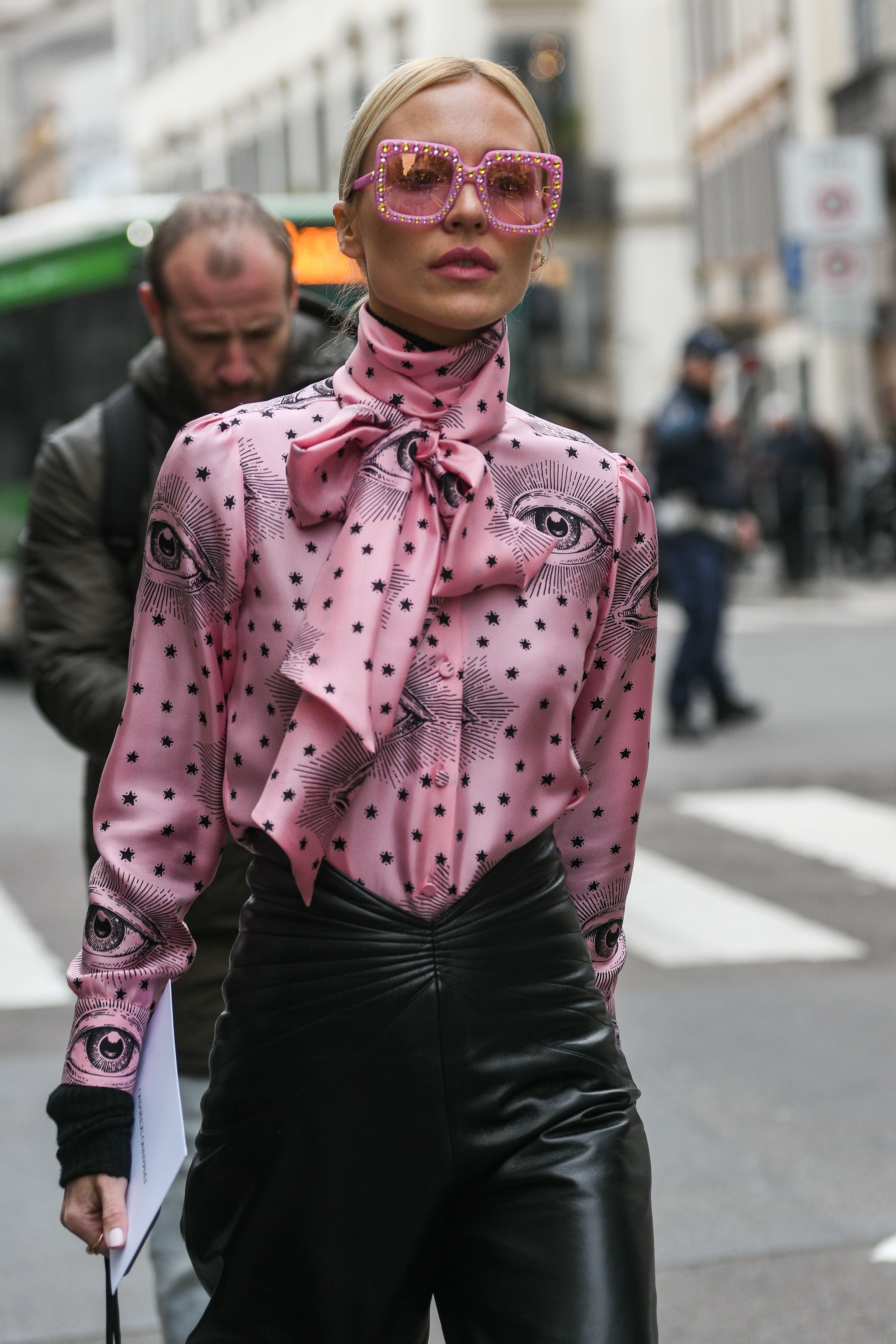 A guest is seen outside Milan Fashion Week in a unique pink patterned blouse and pink sunglasses.