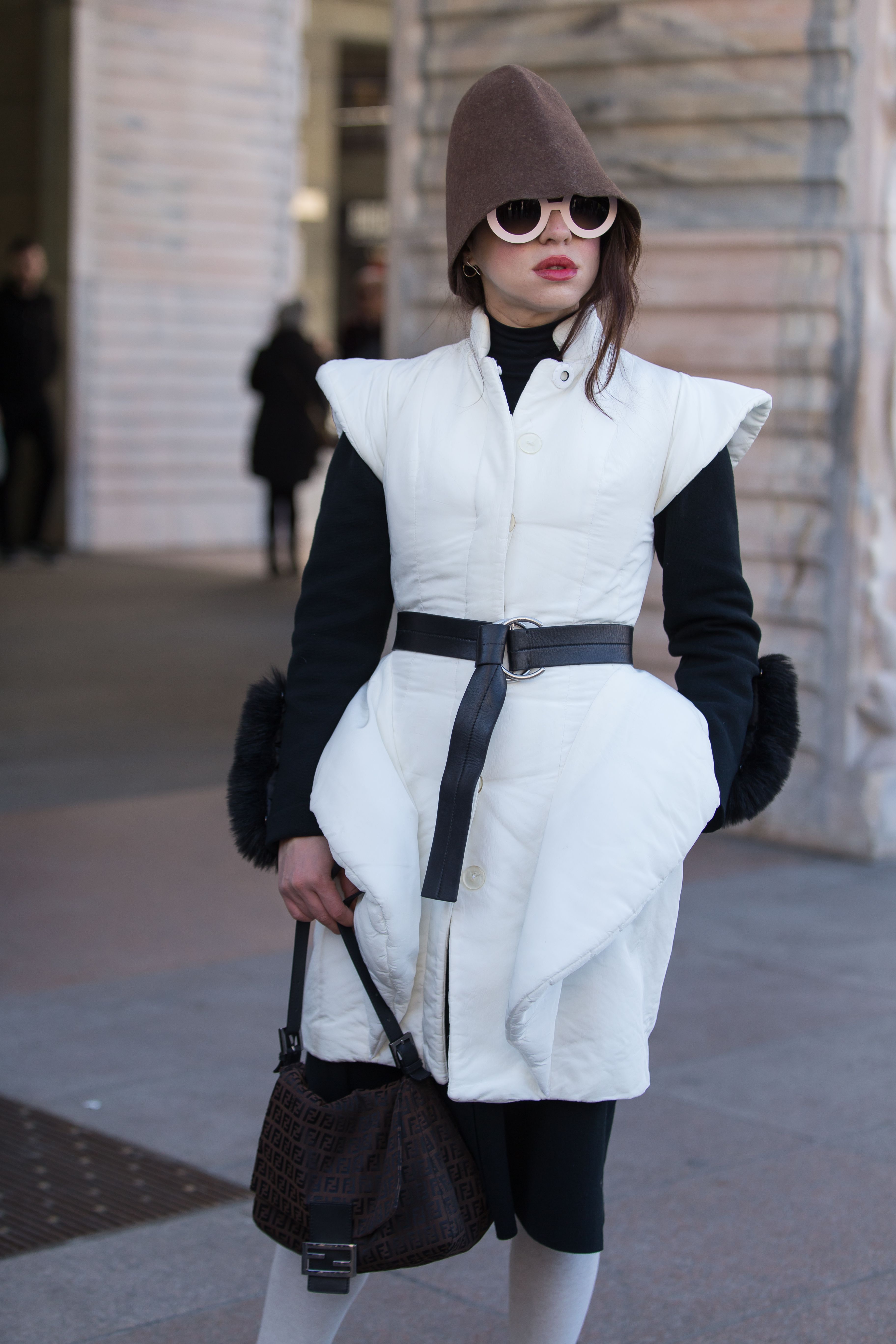 A guest is seen wearing a white puffer coat, hat and pink sunglasses outside Milan Fashion Week.