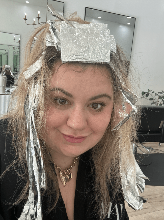 But first, before I could update my blonde, I had to try the new K18 Prep + Repair Service. After discussing my color needs and my breakage concerns, Dawson applied the professional-use-only K18 Peptide Prep Pro Chelating Hair Complex to my strands. “[It removes] the minerals and metal buildup on your hair from hard water,” Dawson explained. “It’s helping neutralize all those chemicals before going in on a color service.”