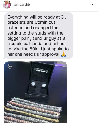 The Invasion of Privacy rapper tagged Pristine Jewelers in her post. The NYC based jeweler has laced everyone from DJ Khaled and his son Asahd to Justin and Hailey Bieber. In the text that Cardi included in the screenshot the jeweler said, “Everything will be ready at 3, bracelets are comin out cuteeee and changed the setting to the studs with the bigger pair, send ur guy at 3 also pls call Linda and tell her to wire the 80k, I just spoke to her she needs ur approval.”