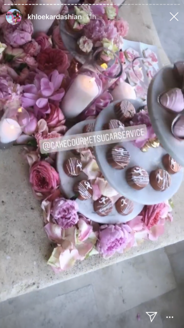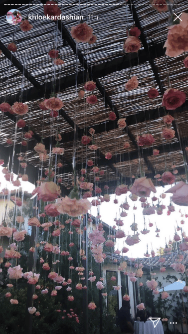 To celebrate her big day, Khloé wore a pink corset (she had to match the decor) along with her diamond choker which spelled out “True” on it. Kylie obviously spent a ton of time on the decor for the venue. She had flowers and balloons strung up all around the party. Though the flowers were all pink–the balloons were an assortment of pinks, golds, and silvers. There was even a neon pink sign that read “Khlomoney.”