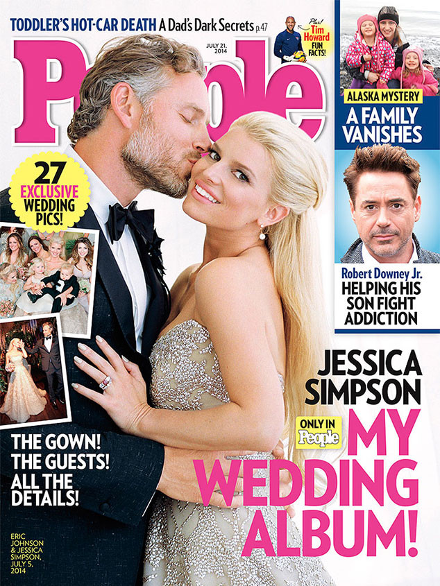 The first glimpse of Jessica Simpson‘s wedding dress is here and, we have to say, it’s gorgeous. The singer, mother, and mogul is featured on the cover of People wearing a champagne-hued, heavily beaded gown designed by Carolina Herrera. Her new husband, Eric Johnson, is also pictured on the cover—giving her a big smack-a-roo.