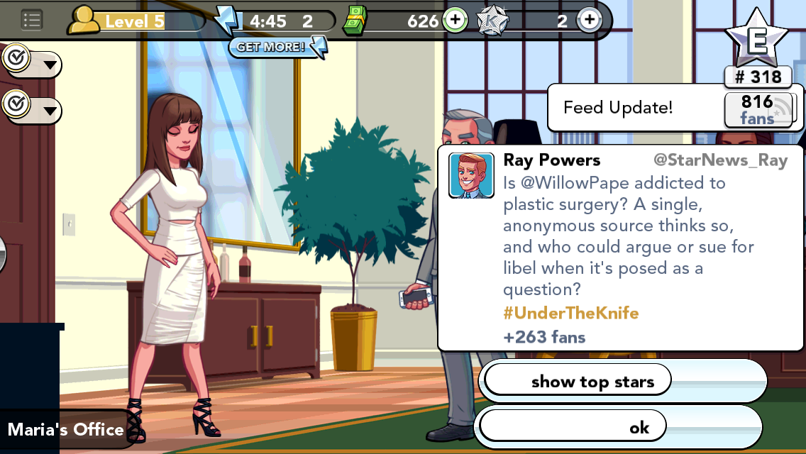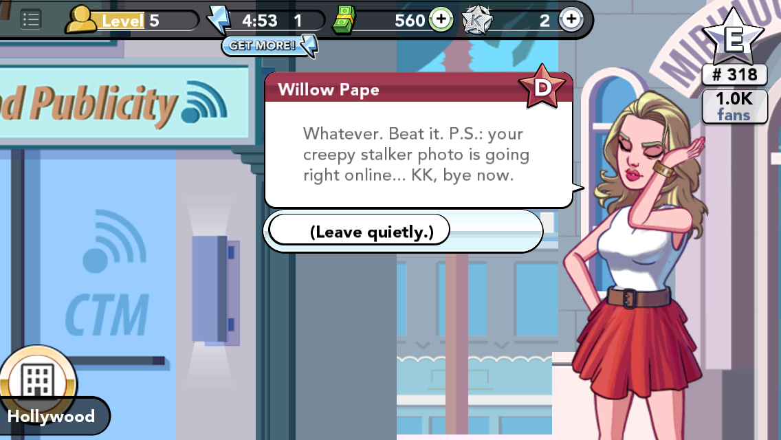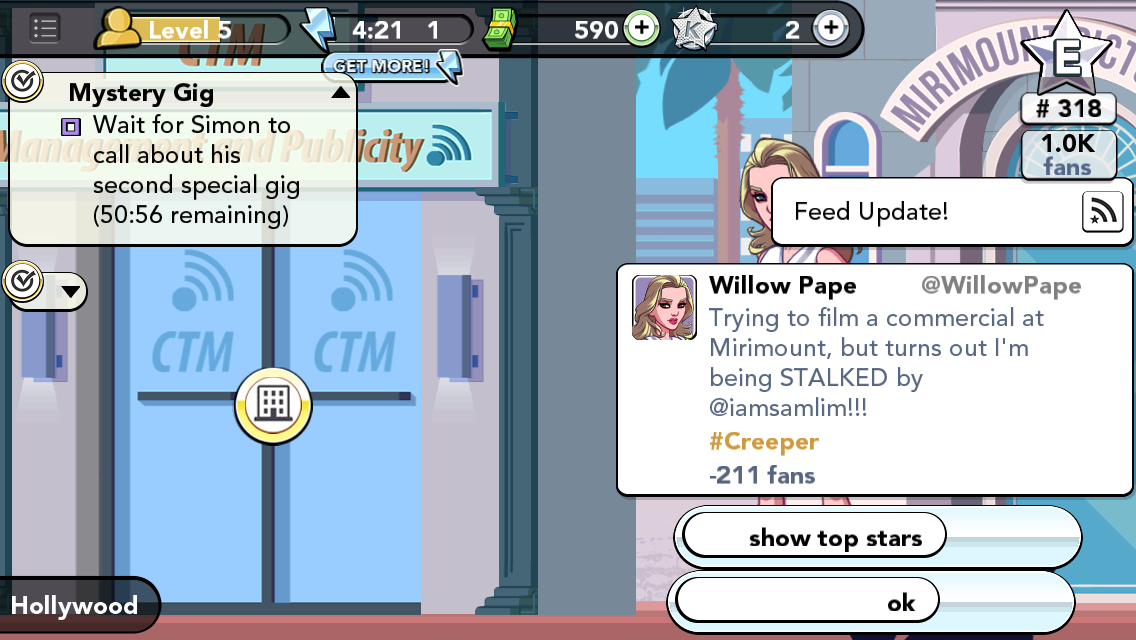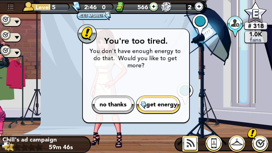 It’s also important to have a good agent who will book you gigs. My agent, Simon, booked me at some editorial photo shoots, a fashion show, and an ad campaign.  When you’re at each event, you complete tasks that get you cash, energy, and K stars, which you need in order to advance.