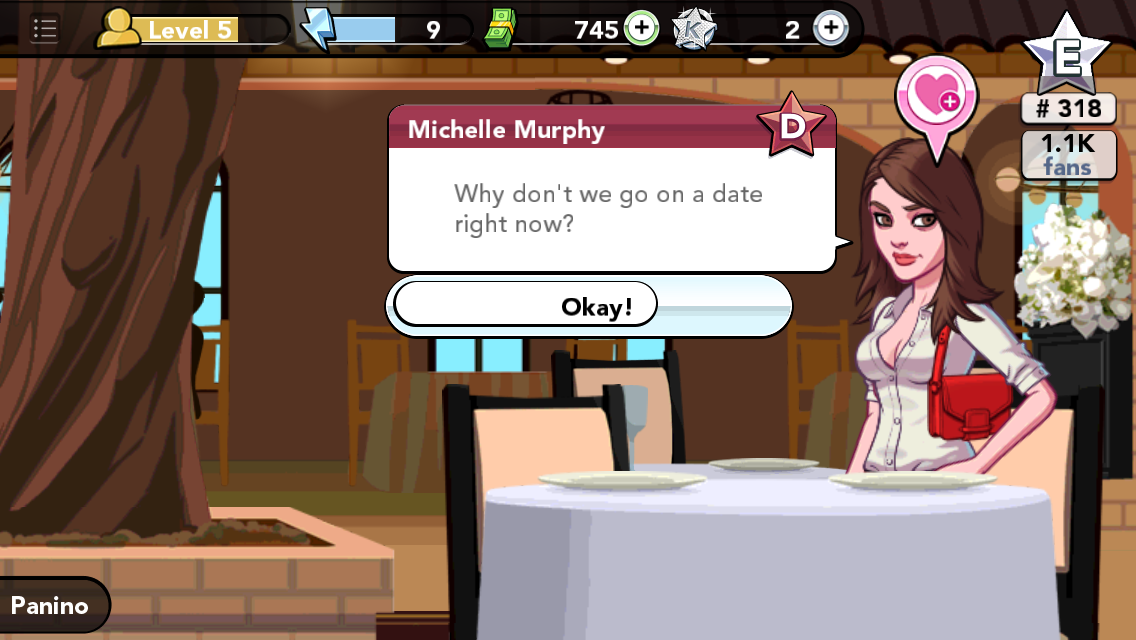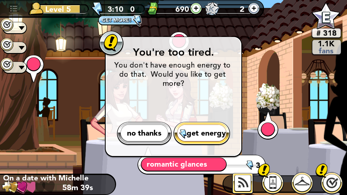 On our date, however, I didn’t have enough free energy points to accomplish any of the goals of “flirt,” “kiss,” or “romantic glance,” so we had this completely awkward dinner where I couldn’t do a thing (unless I wanted to purchase more energy for real life money).
