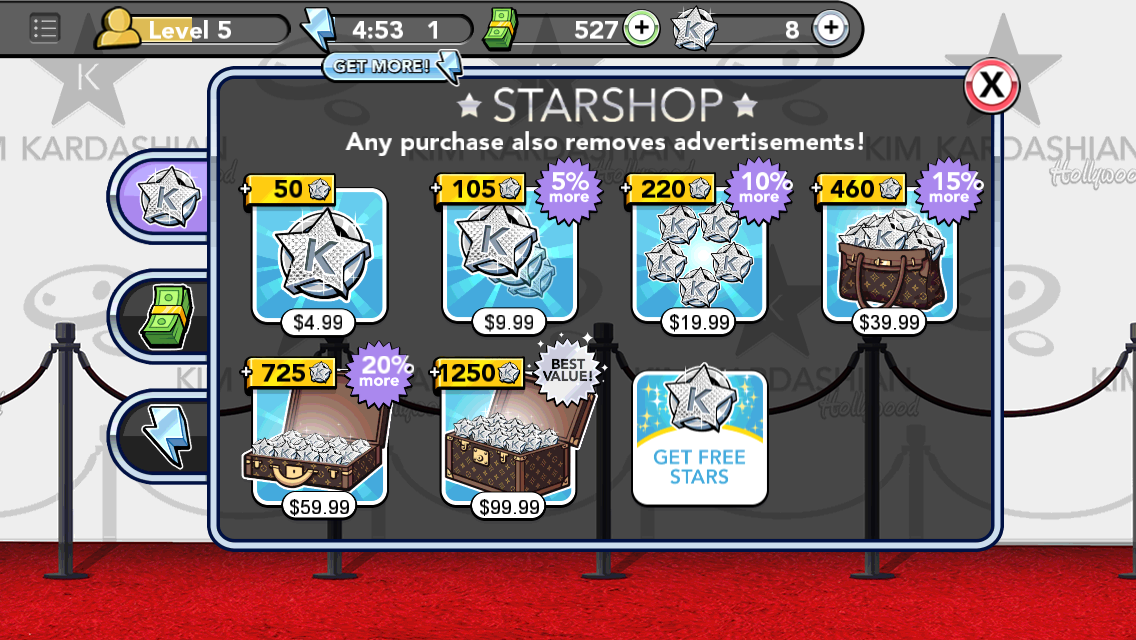 I was in the middle of a photo shoot which could have easily gotten me one notch higher on the social-climbing ladder … but I couldn’t hold a pose because I was too tired.  Desperate for more Kardashian, I really wanted to spend $5 on more stars and be on my way to celebrity status. But since I was refraining from spending actual money, I could do nothing but wait 30 minutes for my energy levels to be replenished.  Thank goodness I was planning to write this story, otherwise I definitely would have caved.