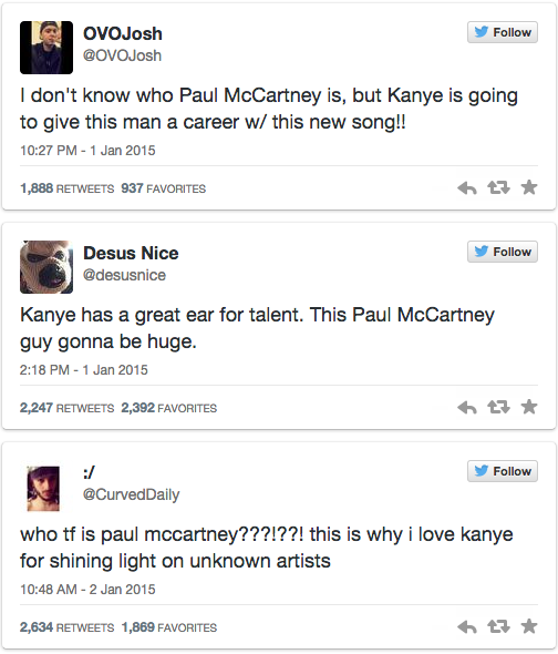 In what might be one of the most straight-up ignorant Twitter exchanges of all times, Kanye West fanatics have congratulated the rapper on having “a great ear for talent” and “shining light” on “unknown” artist, Paul McCartney. These are very much their words, not ours.