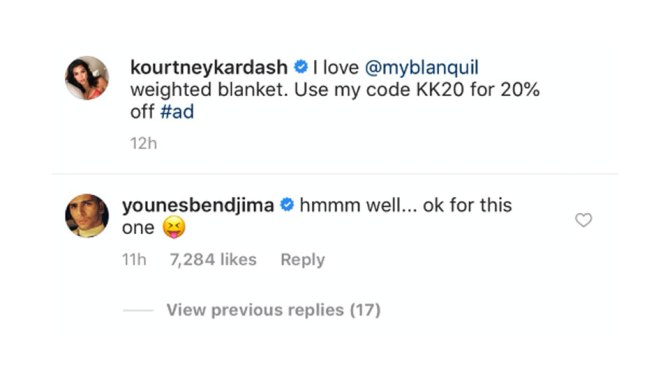 If you’re behind on the drama, the eldest Kardashian sister posted a photo of her posing in a swimsuit—bottom exposed—on Instagram earlier this week. Her boyfriend of two years, 25-year-old model Younes Bendjima, threw some nasty shade in response: “Thats what you need to show to get likes?” The comment didn’t go over well with 39-year-old Kardashian’s fans, and now Bendjima is trying to get back in everyone’s good graces.