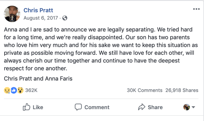 Prior to his engagement with Schwarzenegger, Pratt was married to Faris for nine years. The couple split up August of 2016 and fans were truly devestated. This time, Twitter and Facebook were the selected social media platform for this announcement. Both posted statements saying that they will forever love and respect one another and always make sure Jack, their 6-year-old son, was kept out of it.