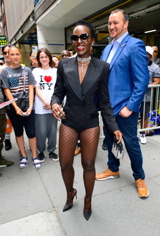 Lupita is truly resurrecting my love for fishnet ‘fits with this latest look. Yesterday, she was seen in NYC wearing a chic blazer and barely-there bottoms. Accessorized with an iced-out mini purse and layered necklaces dripping in diamonds, she’s making the pantless trend look like a million bucks. (Which is probably how much that necklace costs.) Even with accessories that extravagant, her fishnets and black pumps still steal the show.