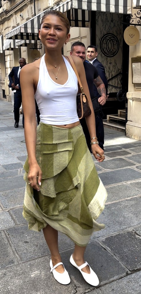 During the 2024 Olympics in Paris, Zendaya was seen freeing the nipple in a tiny white crop top. She paired the basic top with a green layered midi skirt, a Louis Vuitton shoulder bag, dainty jewelry, and white mary janes. Not only is this a classy twist on the braless look, it’s actually a super simple outfit. Z’s look is really proving that you don’t need to wear something over-the-top to look good. (But, keep in mind she looks good in everything.)