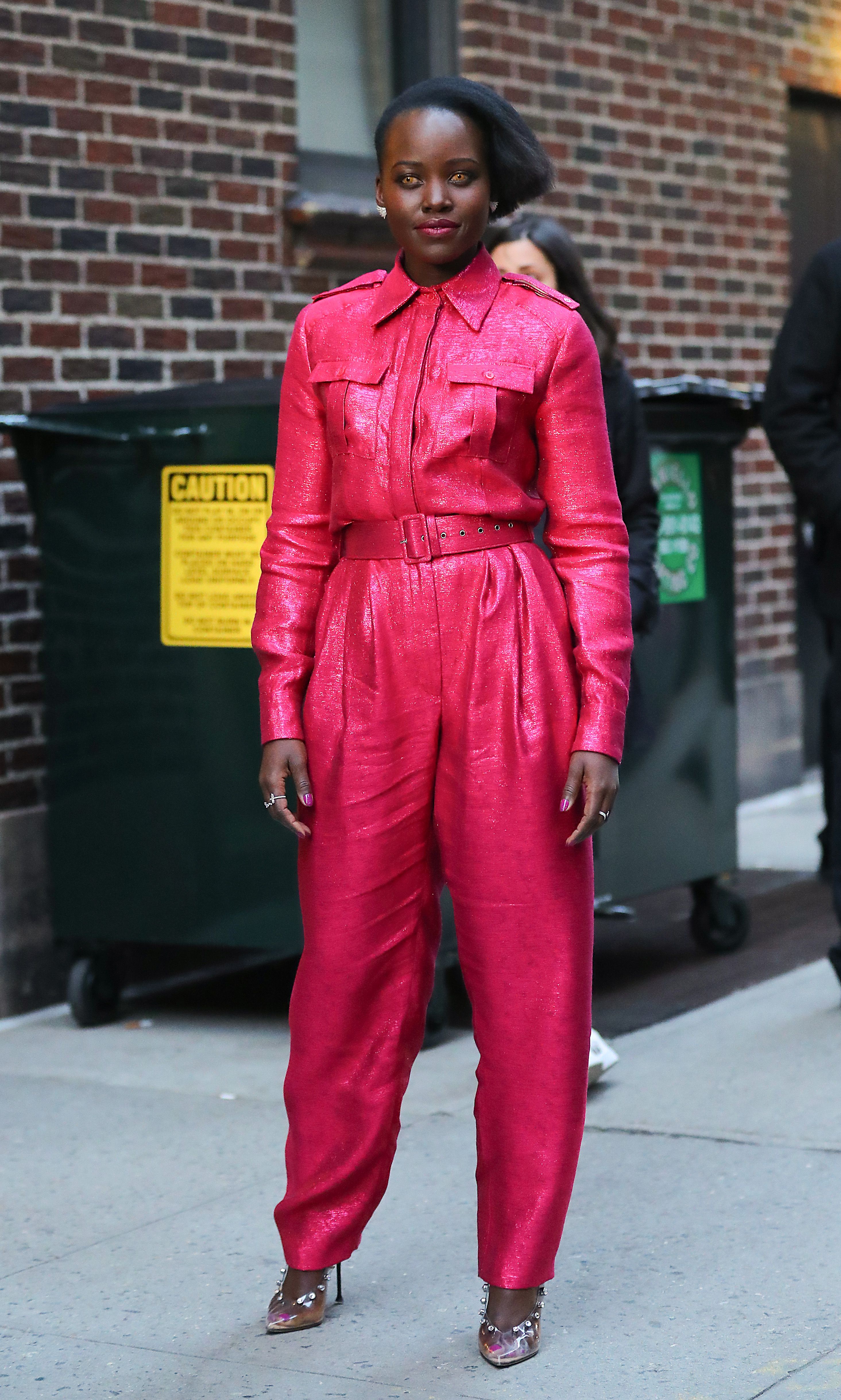 Nyong’o, promoting her new horror movie Us, decided to not only change her look for the filming of The Late Show, but also her eye color. In addition to the effortlessly chic pink jumpsuit and translucent (but also embellished!!) heels, Nyong’o sported gold contacts in homage to one of her creepy characters in the film. I’m a little scared, but it’s mostly because of how obsessed I am with the hot pink jumpsuit—and every single outfit Lupita Nyong’o wears. I never want these promotional interviews to end!