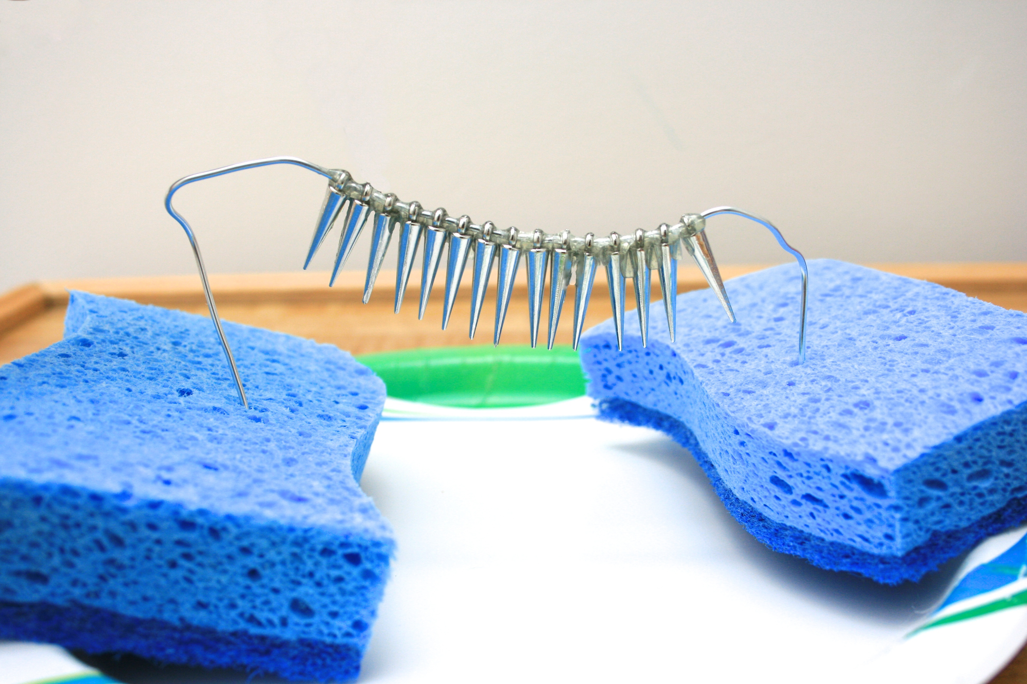Step 3: Place the two sponges on the paper plate and “poke” each end of the wire into each sponge to anchor them, allowing the spikes to hang upside-down.