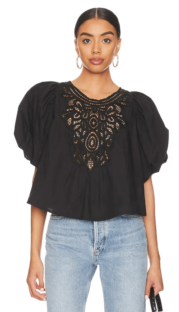 You can’t go wrong with a breezy blouse. The combination of the embroidery and puff sleeves on this option is adorable.