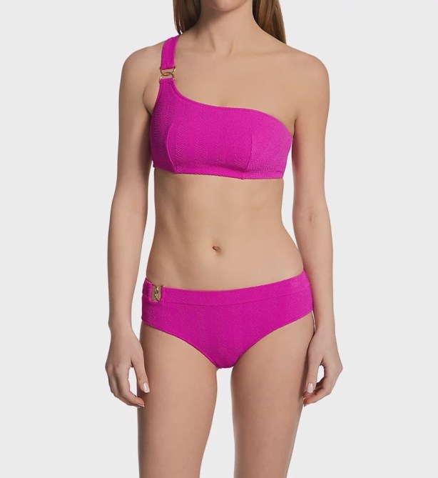 Two of this summer’s hottest swim trends in one suit — one-shoulder cut and ring details. Don’t be alarmed by the lack of straps, BTW. The bikini’s wireless cups will keep you secure all day long.