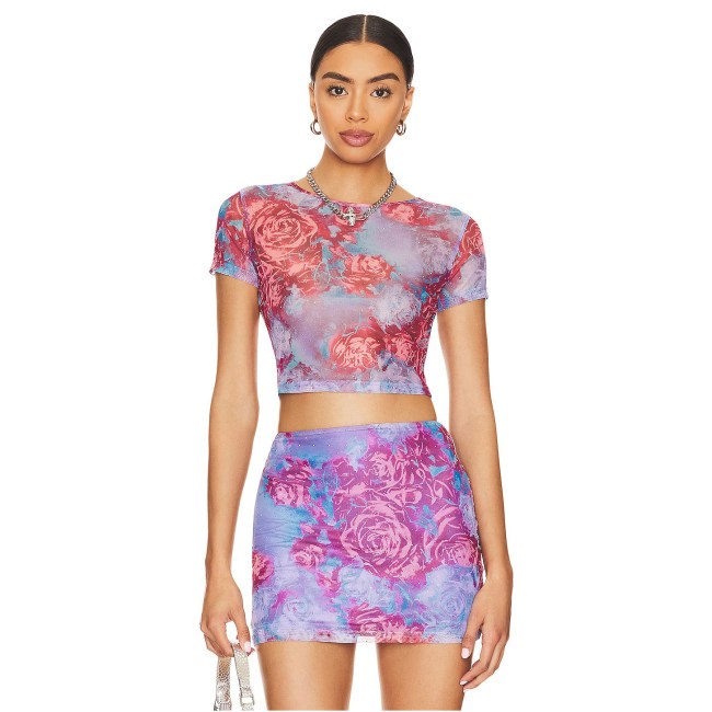 Think of this pick as the more relaxed, daytime alternative to Swift’s sheer shirt. It still features a pretty pink rose print, but the short sleeves make us think it would look great with some baggy jeans — or even a Travis Kelce-approved pair of leather pants!