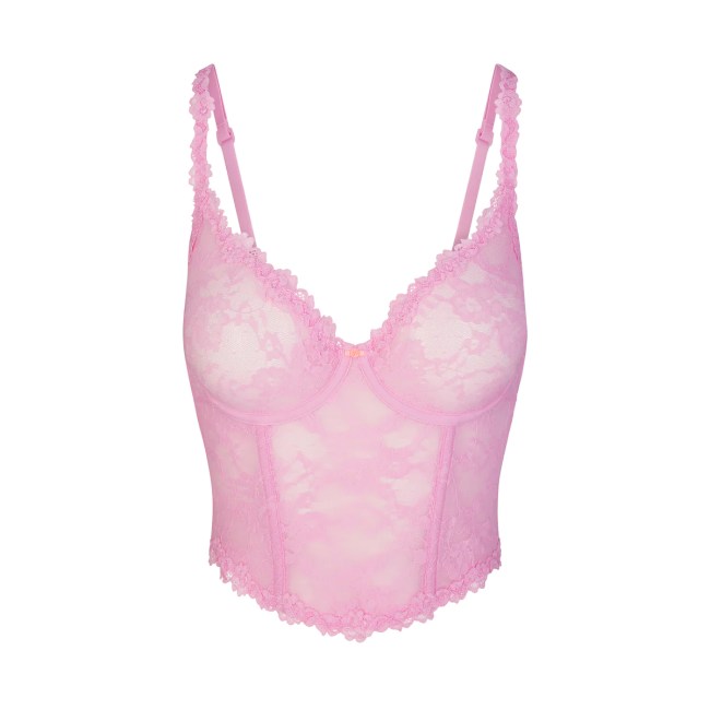 We’re not over the all-pink everything and it seems SKIMS isn’t either. The brand released this cute stretch lace corset top, which carpenter wears in the photos, but if the sweet shade isn’t your thing, it also comes in lemonade yellow and a gray talc.