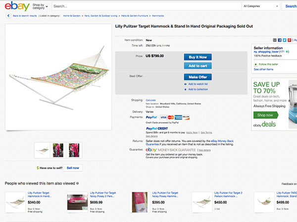 Colorful dresses and home goods with original under-$40 asking prices are going for well over $100 on eBay, and some items—like the particularly popular hammock from the collection—has been marked up by as much as 433 percent by some eBay resellers.