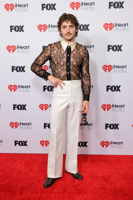 Benson Boone wears a lace black top with white trousers.
