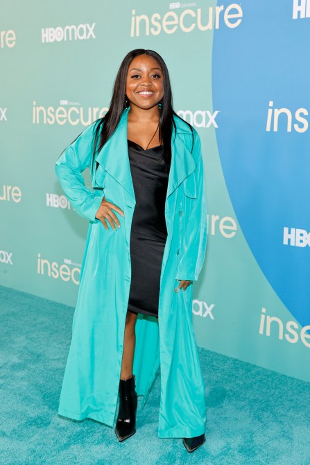 Quinta Brunson wears a black mini dress and teal blue trench coat.