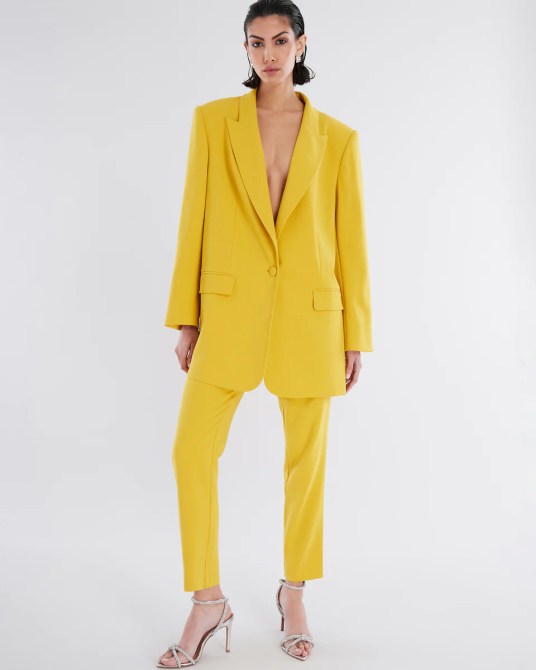 This canary yellow blazer and pant combination is sure to make a statement. This can easily be dressed up with a silk top underneath, sequin heels and a beaded bag. The best part is that you can tone the look down with a button-down (as pictured) and wear it to the office. The blazer and pants are available in sizes 14-32.