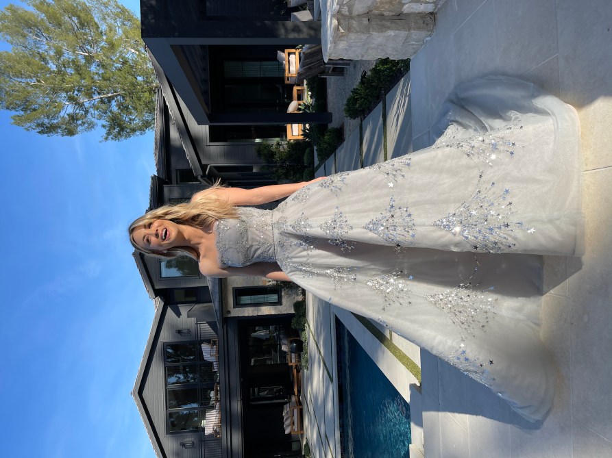 Styled by celeb stylist Brad Goreski, Cuoco was shining bright in this gray Oscar De La Renta gown complete with sparkly silver starbursts.