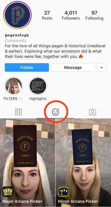 If you’re like me, you might have done a double-take when you first caught sight of the “tarot” filter by Instagram user @autonommy or @paganology’s “Major Arcana Picker” shuffling over your friend’s head. But lucky for you, spotting these filters in-use is one of the easiest ways to get access to them.