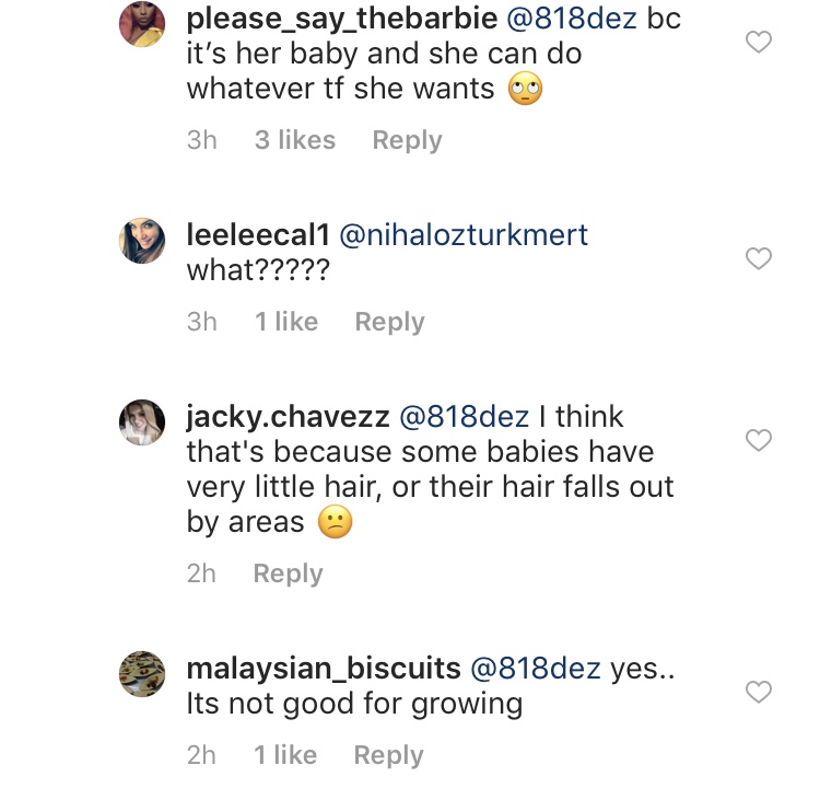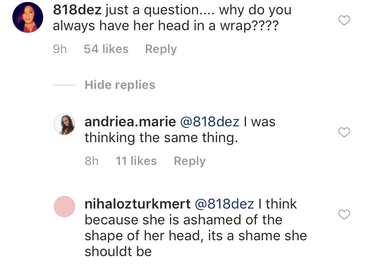 Fans criticized Khloé’s True’s natural hair and head shape, accusing her of being “ashamed” of it. Many pointed out that this isn’t the first time that the Keeping Up with the Kardashians star has covered True’s head either. Recent pictures show the baby with some sort of head covering, from scarves to headbands. The critics mainly accused Khloé of being ashamed by True’s appearance, though there were some who also accused her of hindering True’s growth by covering her head with wraps. A few comments included: