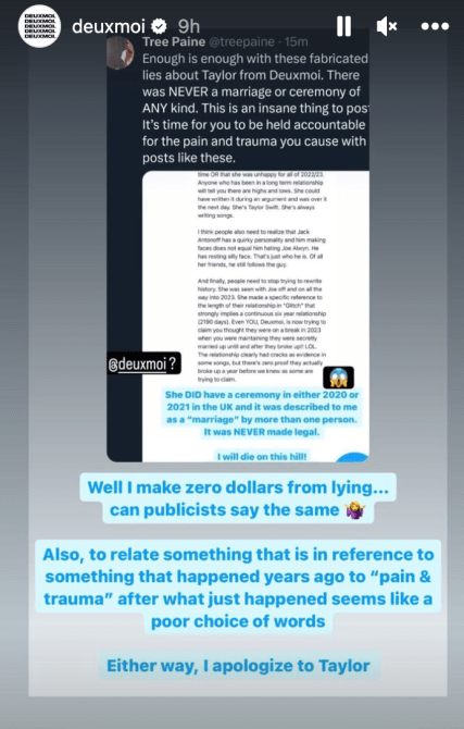 What did Tree Paine say in response to DeuxMoi’s rumors? Tree Paine took to X (formerly Twitter) to address Deux Moi’s comments. She posted, “Enough is enough with these fabricated lies about Taylor from Deuxmoi. There was NEVER a marriage or ceremony of ANY kind. This is an insane thing to post. It’s time for you to be held accountable for the pain and trauma you cause with posts like these.”