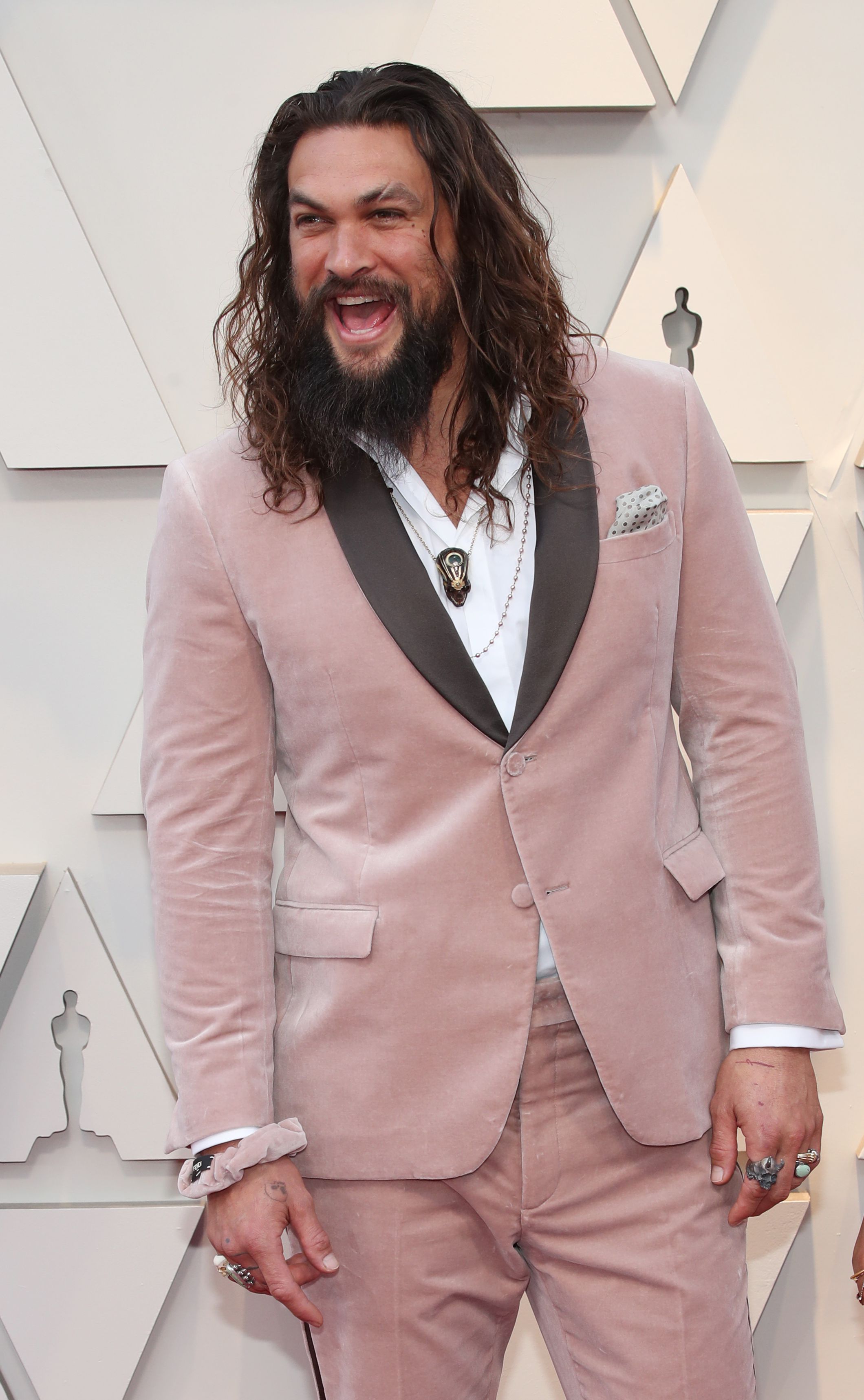 Jason Momoa looked fierce in a pink look for the 2019 Oscars.