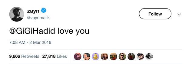 “zayn after tweeting gigi that he loves her and she came online and didn’t reply”